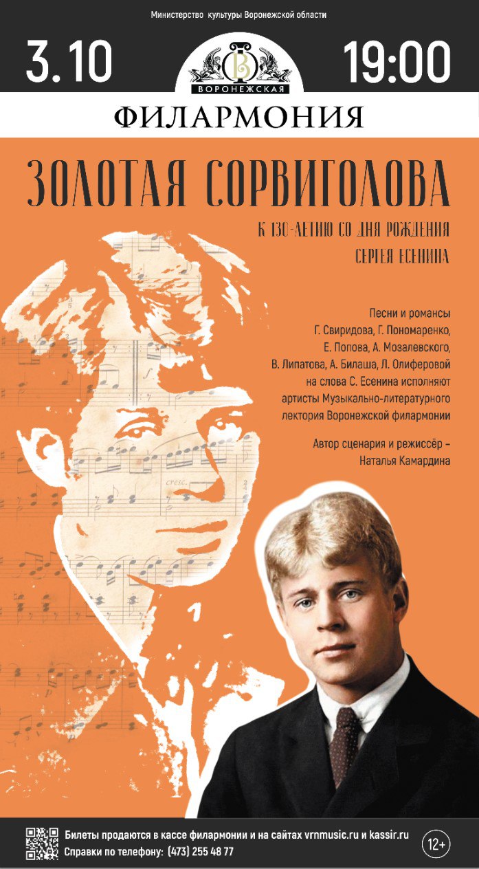 3 октября в 19:00 в Воронежской филармонии состоится литературно-музыкальный вечер «Золотая сорвиголова», посвященный 130-летию со дня рождения Сергея Есенина. Мероприятие предложит зрителям многогранное погружение в творческое наследие поэта через синтез музыкальных и драматических искусств.