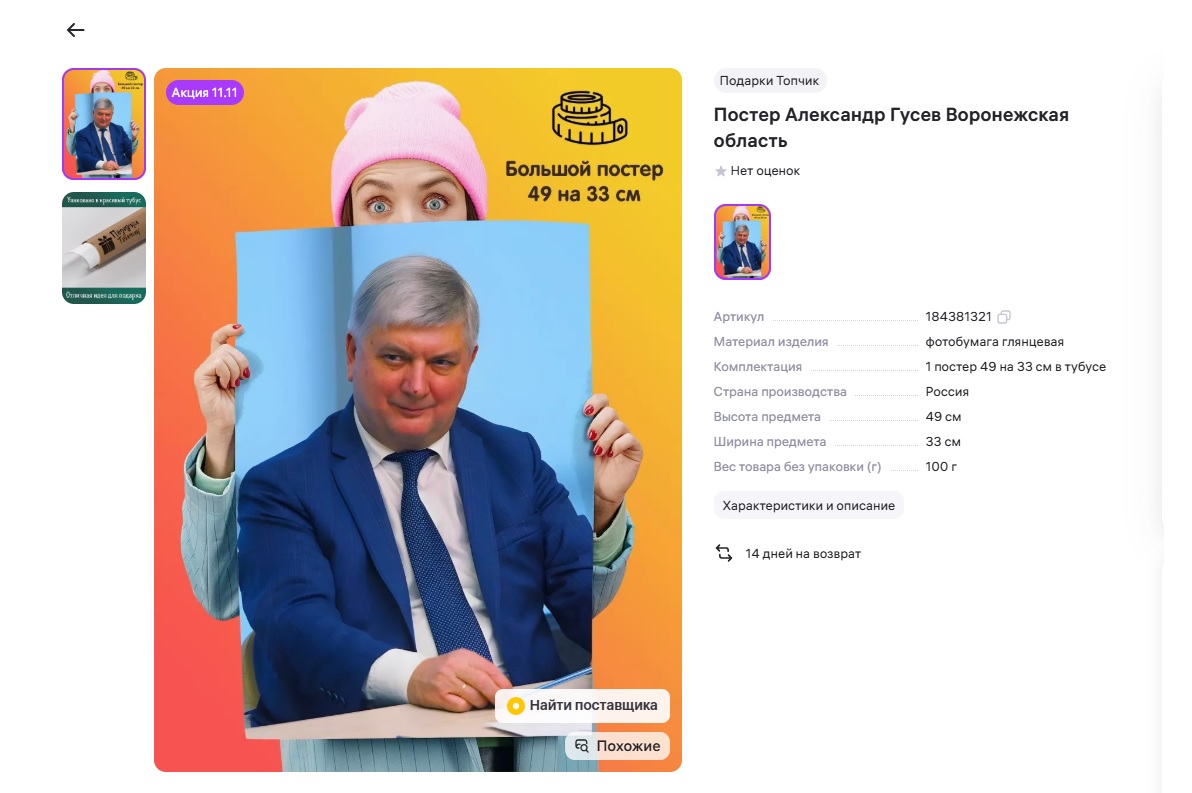 На одном из популярных онлайн-маркетплейсов появился в продаже интерьерный постер с изображением губернатора Воронежской области Александра Гусева. Как сообщает издание «Обозреватель.Врн», изначально продавец предлагал плакат за 600 рублей, но сейчас цена снижена до 183 рублей.