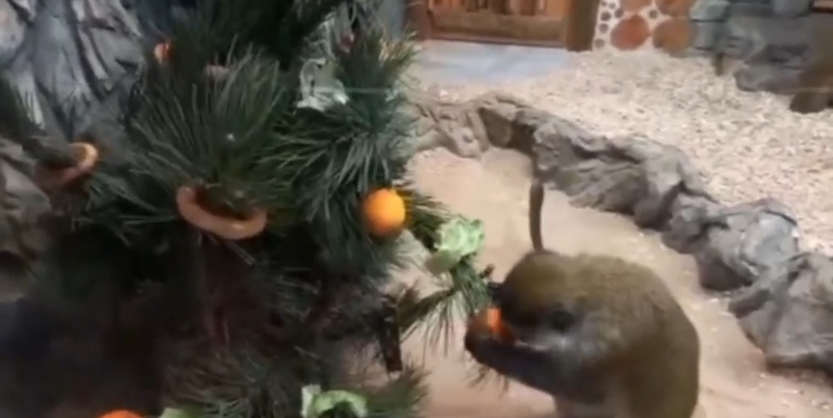 Мероприятие приурочено к отмечаемому сегодня Дню обезьян и направлено на обогащение среды обитания животных. Как видно на опубликованных кадрах, обезьяны сразу проявили любопытство к необычному украшению и приступили к дегустации съедобных игрушек. В качестве угощений на ветвях ели разместили мандарины, кусочки ананаса, бублики и листья капусты.
