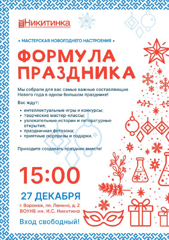 Областная библиотека имени И.С. Никитина приглашает жителей и гостей города на интерактивную программу «Формула праздника», которая пройдет 27 декабря в 15:00. Мероприятие задумано как творческая лаборатория по подготовке к встрече Нового 2026 года.