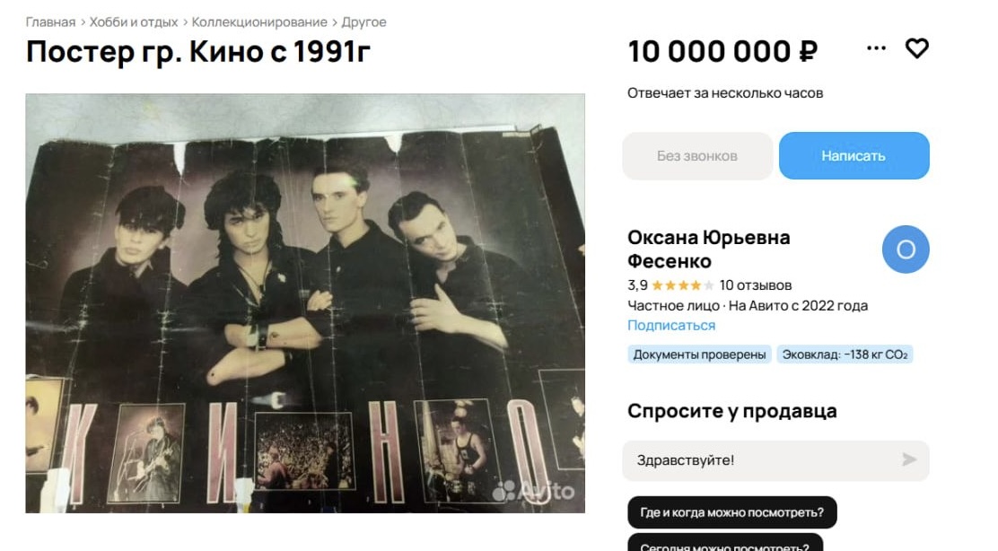 На популярной интернет-площадке в Воронеже появилось объявление о продаже редкого постера советской рок-группы «Кино», выпущенного в 1991 году. Владелец раритета установил цену в десять миллионов рублей.