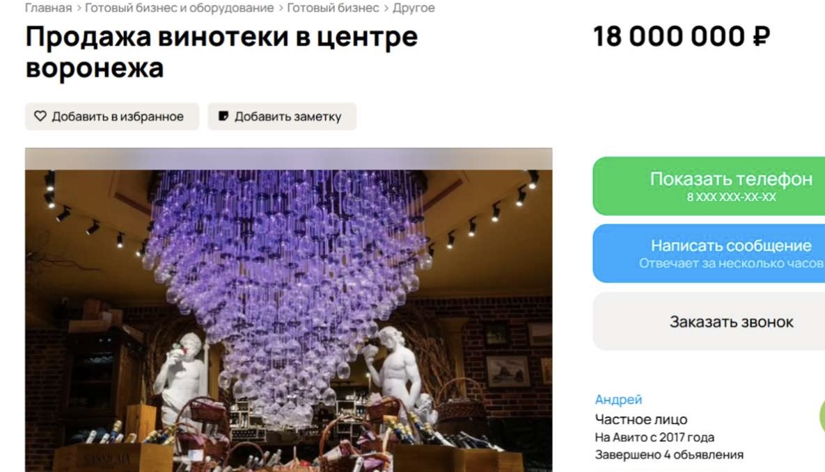 В центре Воронежа на площади Ленина выставлен на продажу винный бутик стоимостью 18 миллионов рублей, сообщается на сайте объявлений.