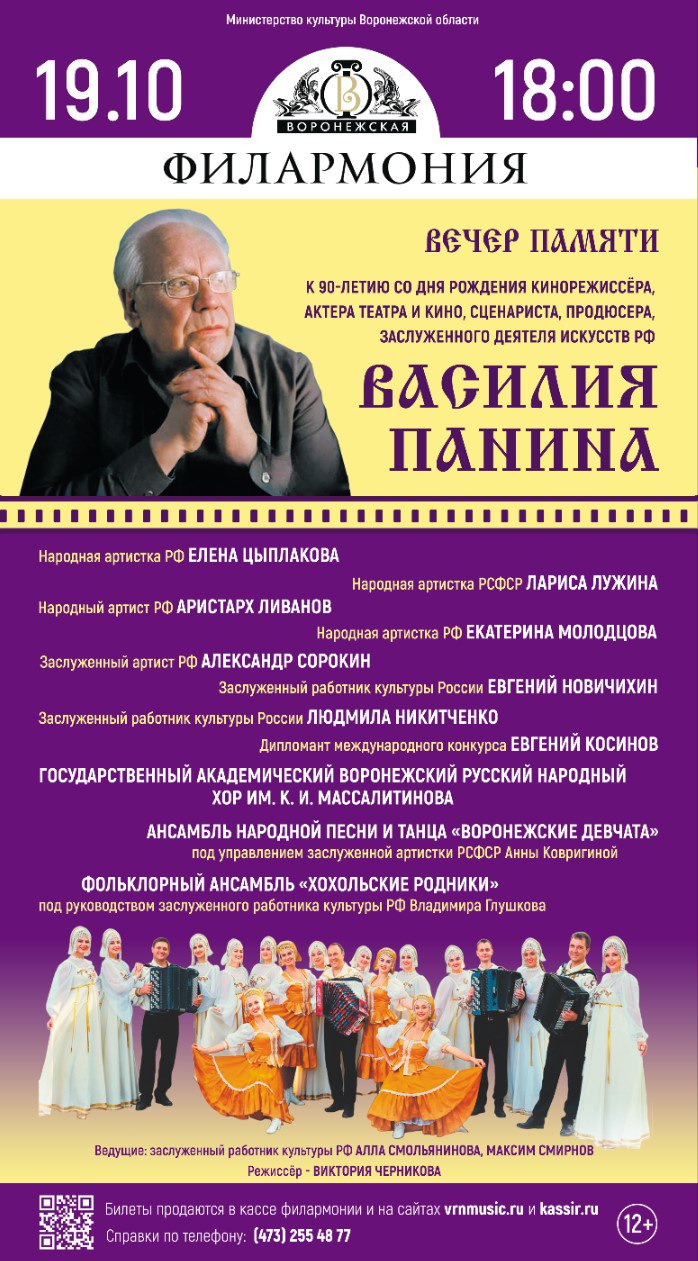 Воронежская филармония приглашает на торжественный вечер памяти Василия Панина – кинорежиссера, актера, сценариста, продюсера и заслуженного деятеля искусств РФ. Мероприятие станет данью уважения многогранному таланту мастера, чей вклад в отечественную культуру остается значимым и сегодня.