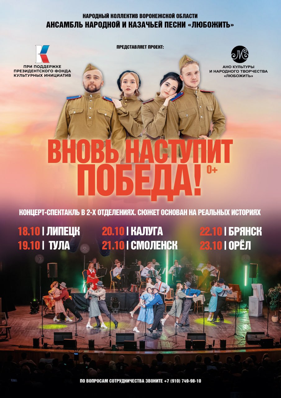 Воронежский ансамбль «ЛюбоЖить» отправляется в масштабный тур по Центральной России с уникальной театрализованной постановкой «Вновь наступит Победа!». Спектакль, созданный при поддержке Президентского фонда культурных инициатив, будет показан в шести городах: Липецке, Туле, Калуге, Смоленске, Брянске и Орле.