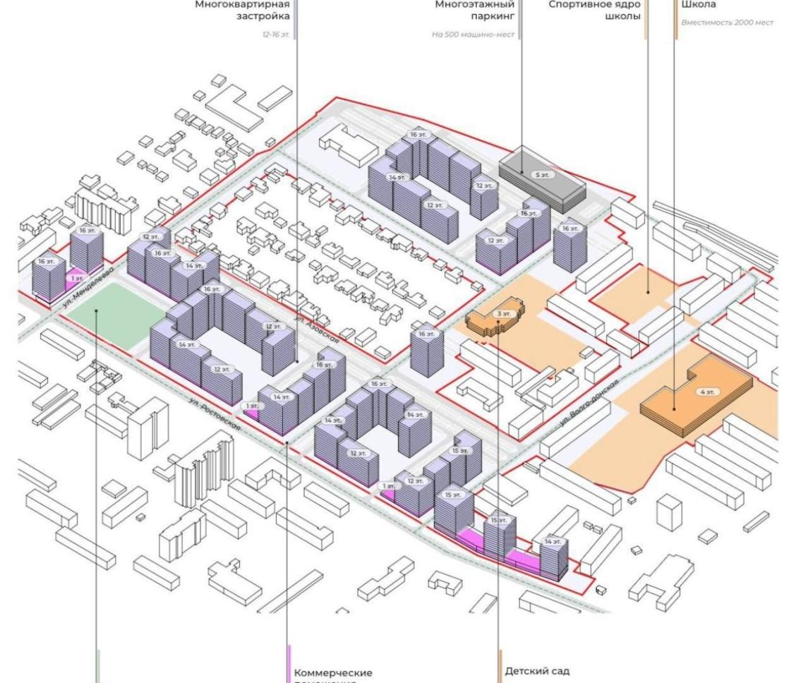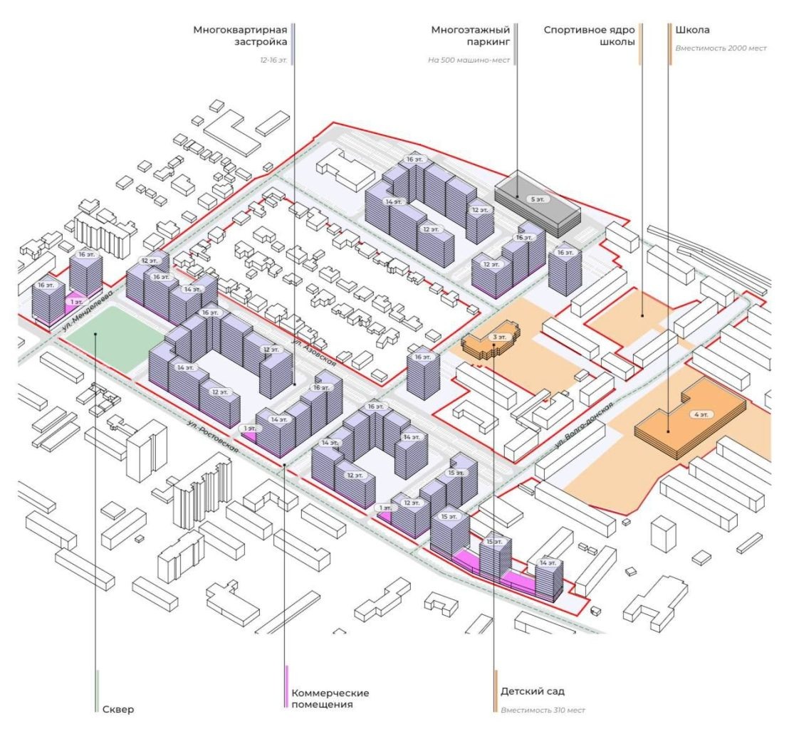 Проект благоустройства территории площадью 25 гектаров уже согласован архитектурной комиссией. По словам руководителя бюро «ПАСП» Андрея Тютерева, жилые дома переменной этажности (от 12 до 16 этажей) будут иметь дворы, свободные от автомобилей. Для размещения транспорта жителей предусмотрено строительство многоэтажной парковки на 500 машиномест. В рамках комплексного развития территории также запланирована реконструкция местной школы и дополнительное озеленение улиц Менделеева и Ростовской.