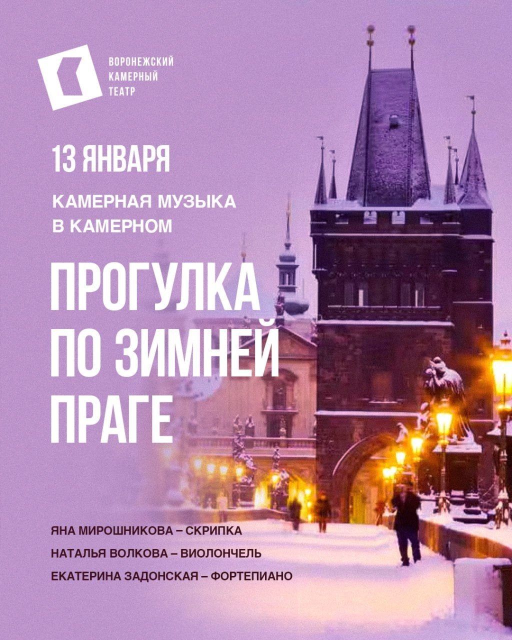 В канун Старого Нового года Воронежский камерный театр приглашает зрителей на особенный концерт «Музыка Старого Нового года: зимняя Прага». Вечер, который состоится 13 января на большой сцене, перенесет слушателей в атмосферу заснеженной чешской столицы.
