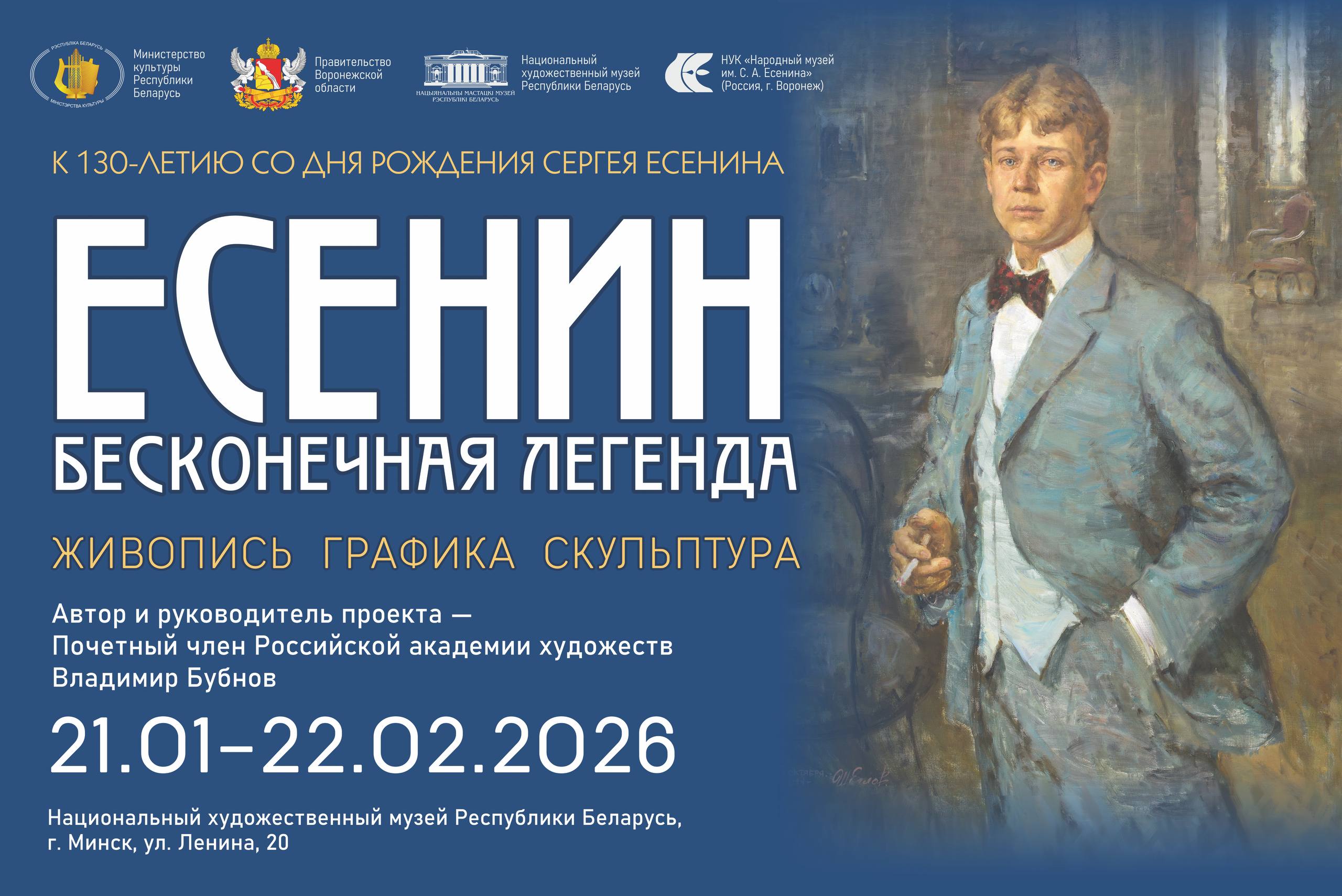 21 января в Национальном художественном музее Беларуси в Минске откроется масштабный выставочный проект «Сергей Есенин. Бесконечная легенда», организованный Воронежским Народным музеем Сергея Есенина. Экспозиция подготовлена при поддержке правительства Воронежской области и Российской академии художеств и приурочена к 130-летию со дня рождения поэта.
