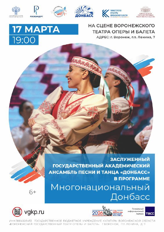 17 марта в 19:00 на сцене Воронежского театра оперы и балета состоится концерт академического ансамбля песни и танца «Донбасс». Гастроли знаменитого коллектива организованы в рамках Всероссийского гастрольно-концертного плана Министерства культуры Российской Федерации. Воронежским зрителям будет представлена сольная программа «Многонациональный Донбасс».