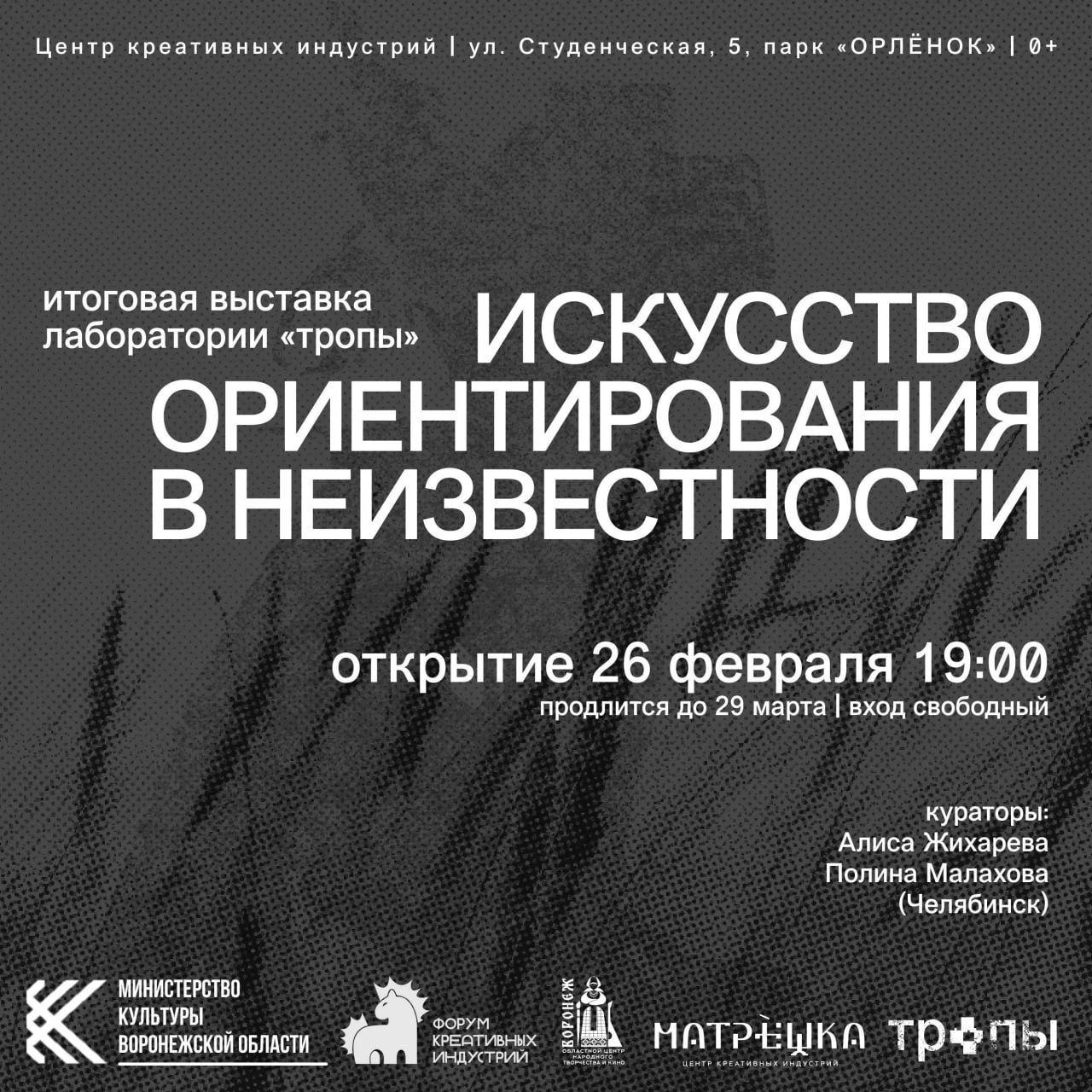 26 февраля в 19:00 в галерее Центра креативных индустрий «Матрешка» начнет работу выставка «Искусство ориентирования в неизвестности». Экспозиция приурочена к предстоящему Форуму креативных индустрий, который пройдет 27–28 марта и будет посвящен теме «Вдохновение в истоках».