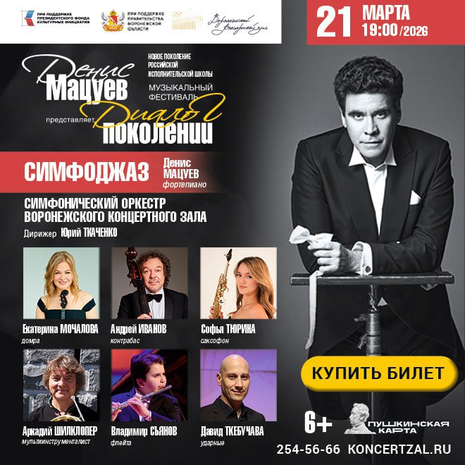 21 марта в 19:00 – программа «Симфоджаз». Мацуев представит джазовые импровизации вместе с музыкантами разных поколений и симфоническим оркестром Воронежского концертного зала. В программе – вариации на темы Эдварда Грига из музыки к драме «Пер Гюнт», импровизации на тему танца с саблями из балета «Гаянэ» Арама Хачатуряна и другие произведения.