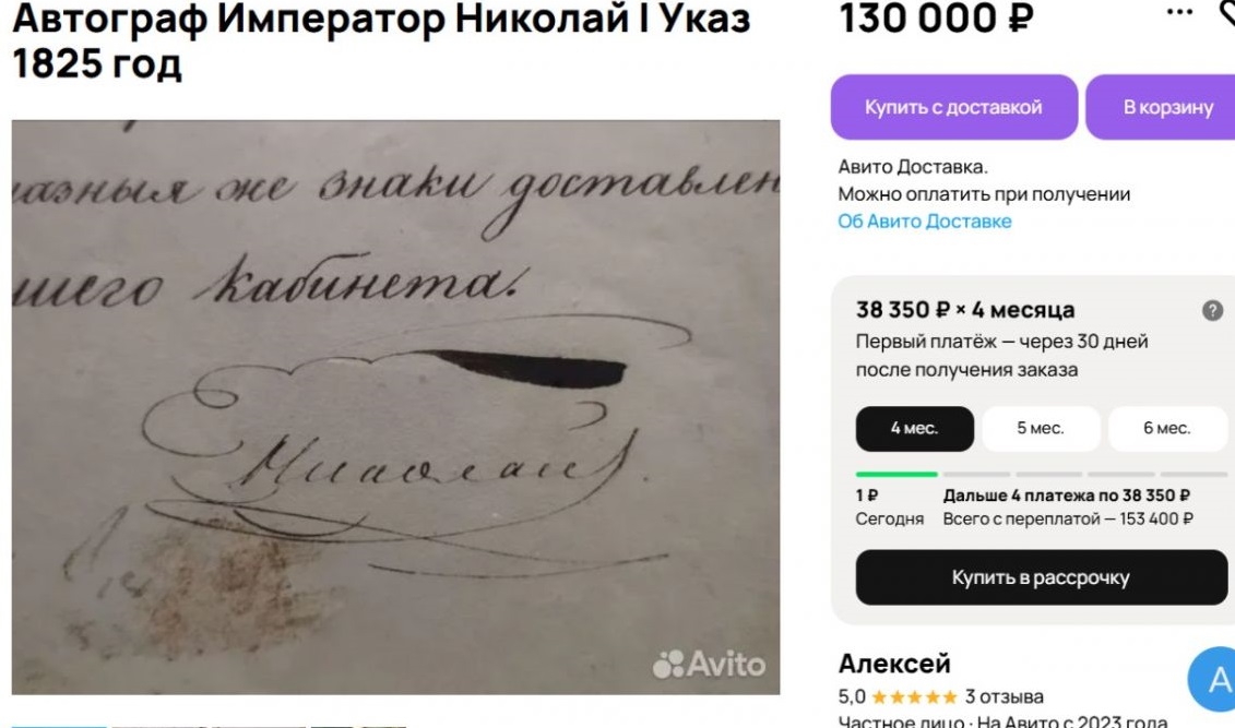 На сайте объявлений житель Воронежа выставил на продажу исторический документ – указ Капитула российских орденов, подписанный лично императором Николаем I.