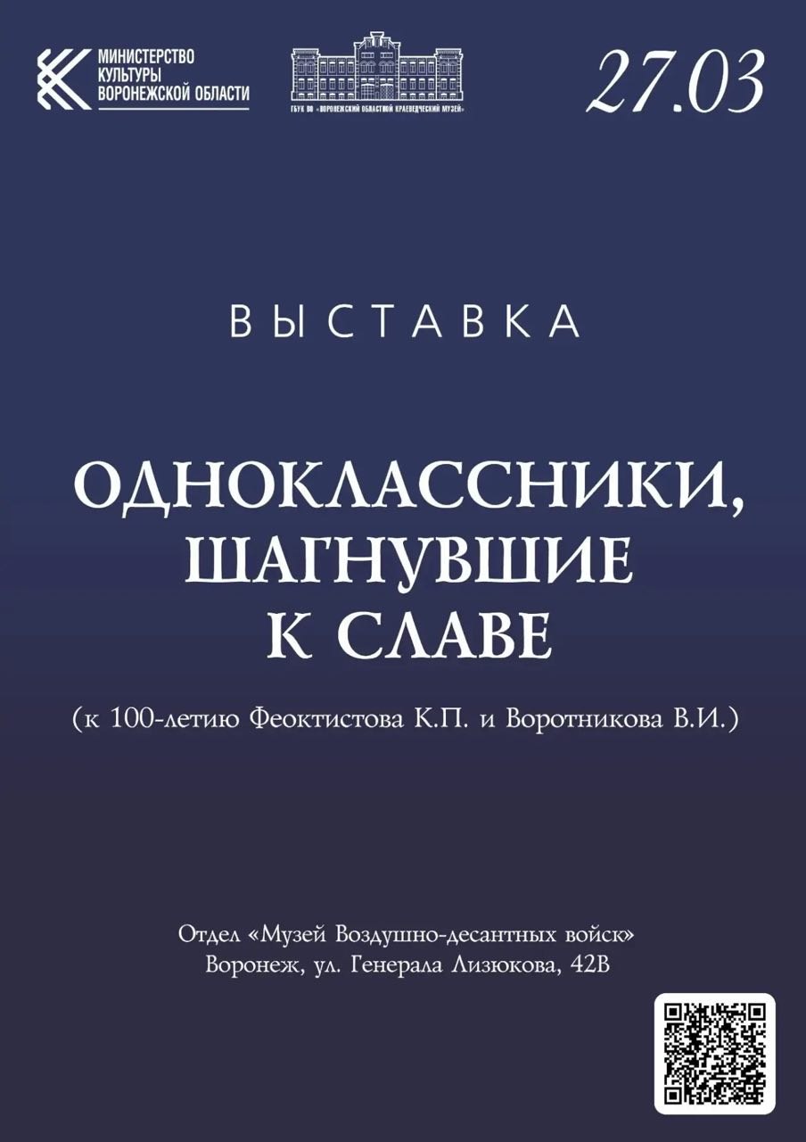 27 марта в 14:00 в Музее ВДВ начнет работу выставка, приуроченная к 100-летию Виталия Воротникова и Константина Феоктистова. Оба родились в Воронеже в 1926 году, учились в одном классе школы №2 Юго-Восточной железной дороги.