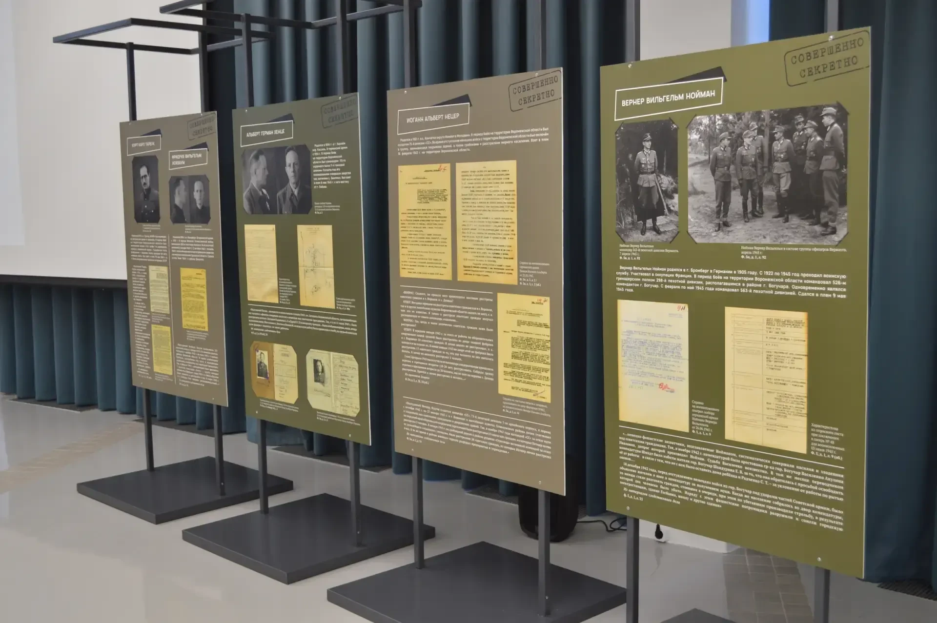 Посетителям выставки напоминают, что Нюрнбергский трибунал имел не только международное значение, но и локальное продолжение – судебные процессы проходили непосредственно в местах, где совершались наиболее жестокие преступления. Один из таких процессов состоялся в Воронеже. Основу экспозиции составили уникальные документы из архива регионального УФСБ, которые долгое время находились под грифом «Совершенно секретно» и лишь сейчас стали доступны широкой публике.