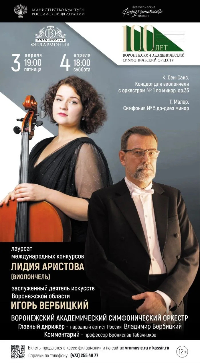 Солировать вместе с Воронежским академическим симфоническим оркестром будет талантливая виолончелистка Лидия Аристова. В программе второго отделения заявлена Симфония №5 до-диез минор Густава Малера. За дирижерским пультом — заслуженный деятель искусств Воронежской области Игорь Вербицкий.