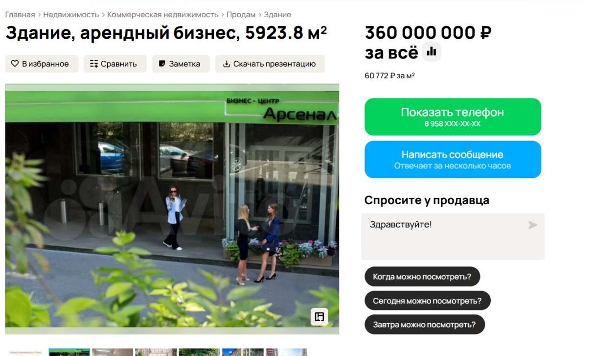 На одном из сайтов объявлений появилось предложение о продаже бизнес-центра «Арсенал», расположенного в самом сердце Воронежа на улице Арсенальной, 3. Стоимость объекта составляет 360 миллионов рублей. Общая площадь здания – 5 923,8 квадратного метра.