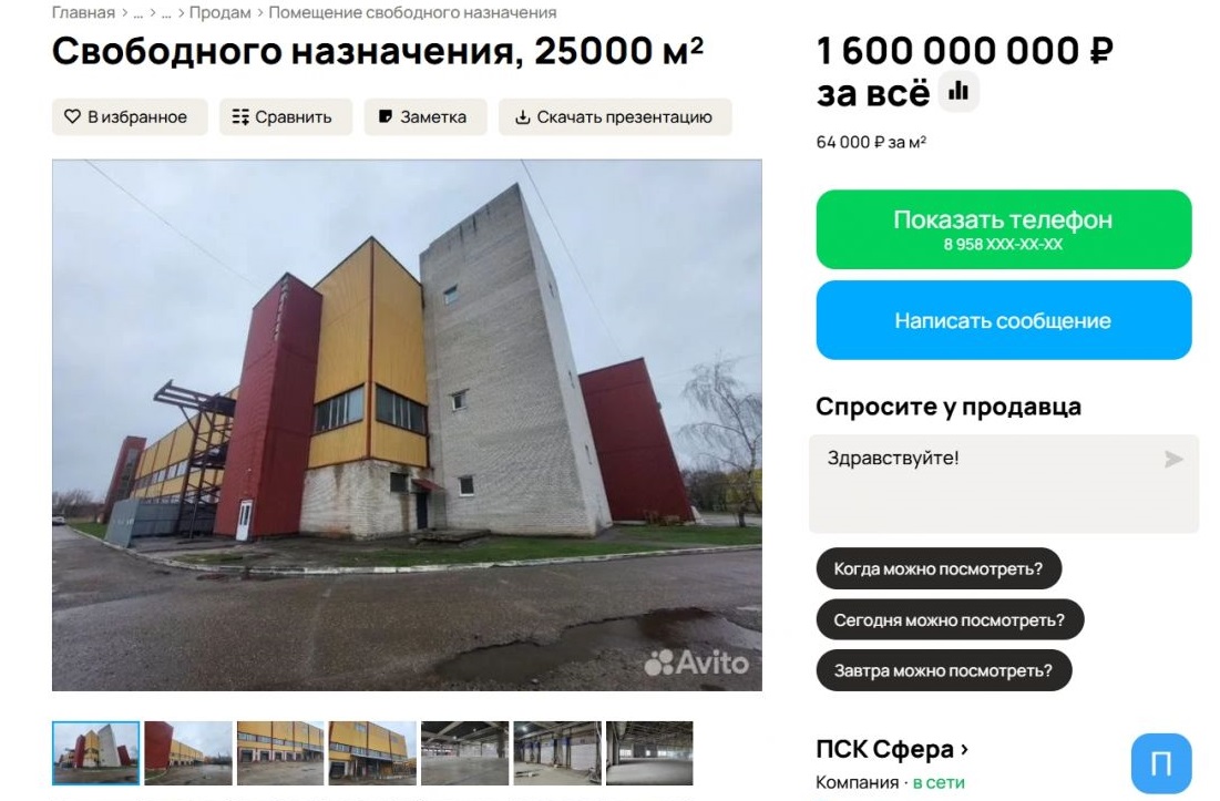 Общая площадь помещений – 25 тысяч квадратных метров. Продавец характеризует предложение как «большое пустое здание» с офисным блоком площадью около трёх тысяч «квадратов». Комплекс размещается на земельном участке размером два гектара.